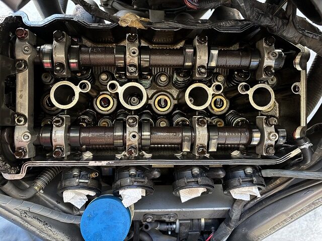 序にバッテリーを交換。恐らく4番がプラグホールへのオイル漏れが少し多めだったので点火できずにリークしていた音は今回の始動時も同じ。軽く熱を入れて今日の動作確認終了。明日また午後にでも始動し熱を入れます。午前中はステムのOリング入れ忘れを処置します。