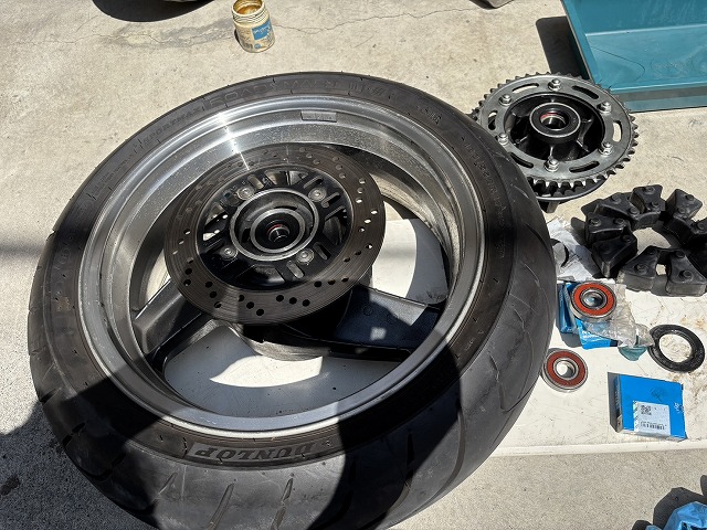 今日の作業は、リアのホイールベアリングやオイルシール交換とハブダンパーの交換。チェーンカバー用タップ(スイングアームのM6)修正。