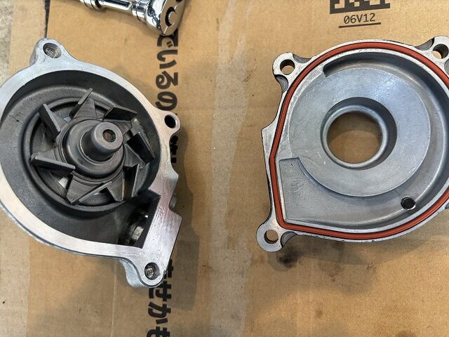 原因はウォーターポンプではなくてオルタネーター。数週間前にカップリングを固定しているボルトの緩みを確認した際に、Oリングを嵌めあいに噛みこませて締めたことが原因のようです。その時はこのOリングは細ってゆるゆるだったのでそろそろ交換しないとと思い、冷却系の部品と一緒に購入していたのが幸いし、今日のウォーターポンプをばらして組むこと2回。やっと原因がウォーターポンプじゃないのでは?と思い周囲を確認すると、オルタネーターの下からダラダラと。確かに、エンジンを掛けた時だけ漏れている気がしていたので納得です。ウォーターポンプはオイルレベルの下にあるので、漏れるとすれば常時漏れるはず。ウォーターポンプのドレンからはオイル漏れの形跡はないし。