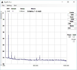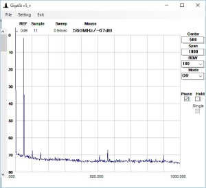 電源付のUSBハブを使用。USBハブの電源アダプタを外しバスパワーでGigastを駆動することで、ノイズの底が低くなるばかりではなく、スプリアスのレベルも下がった。10dBほど。ACアダプタでノイズレベルが下がることは既知の項目。スプリアスのレベルも下がるとは。バッテリー駆動で普段使うべき。