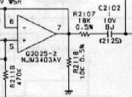 遡ると、NJM3403AVの出力(7番ピン)から信号は出ているものの、次のR2107(18k)の2次側には信号が出ていない。恐らくこれが原因だと思う。基板からの剥離だろうか。抵抗値を測るもMΩ単位。Cなのかな?とも疑うも次にはC2102gがあり、回路図通り1μF。やはりこの18kΩが原因なのかもしれない。当然在庫なし。0.6mm×1.0mmほどの大きさ。無理して1/4WのRでもつけようかな。それとも、全てが勘違いなのか・・・。電池ケース出し入れの際の衝撃による影響だろうか。原因不明。大きな間違いをしているのだろうか。それともこれはコンデンサ?実は他の箇所も黒くない抵抗が・・・違うのかな。Cを計測したけれども、8nFくらいだったような。リアクタンスが1kHzで18kΩに近くなるね。そういうことか?交換の前に半田ごてで温めてみよう。