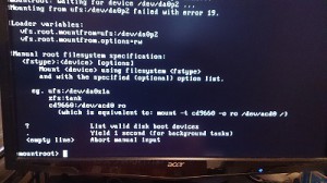 実はfstabをUSBのfstabを編集せず、内蔵HDDのHDDを編集していたために、USBメモリーからの正常起動は確認できず。USBで起動しても、fstabでマウント先が無ければ写真のような画面となる。