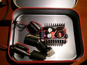 車の中でノートPCを使うためにDC-DCコンバータを用意しました。今までは市販のDC13.8V-AC100Vインバータを使っていましたが、ノイズが酷くコンディションが悪く信号が弱いときなど使い物にならず、運用中は使用出来ませんでした。また、DC13.8V→AC100V→DC19Vと効率を考えてもいいはずがありません。そこで、今回の導入となったわけです。当初、LT1170などを使い回路から組む予定でしたが、買ったほうが安いようですので、amazonでDC-DCコンバータを購入。私が行った作業としては、動作確認とケーシングなどだけです。自作ではありませんね(苦笑)。ローバンドへのノイズが心配でしたので、透磁率不明のコアを5個ほど使用しました。Lを測り透磁率を調べ、使用可能かどうか検討するべきでしたが面倒なので即組み込み。#77材とか#75材のコアがあればよかったのですが。Gigastでノイズをみましたが、結合の仕方も悪いのか殆どノイズらしいものは拾えません。動作確認は、ノートPCが充電状態にあるときにOSを起動させ発熱を確認。ほんのり熱い程度です。出来ることであれば、穴が開いた電源用の放熱ケースに収めたいところですが、お菓子のケースに入れて凌ぐことにします。熱が心配な場合は、蓋を開けることにします。