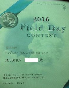 2016 Field Day CONTEST 投稿日: 2017年2月2日 投稿者: jg7sfrコメントする 2016 Field Day CONTESTの賞状が届きました。 各局、QSOありがとうございました。次回もまた04県から参加し、別の部門?と考えています。オールバンドのCW?に出れるといいのですが。