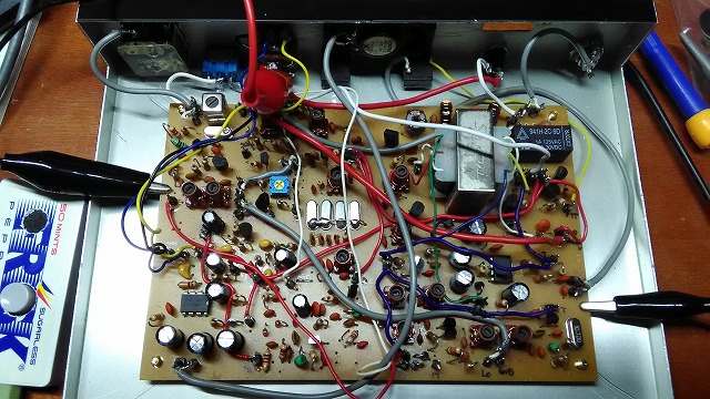 ケースに基板を入れる。送信出力が確認できない。浮遊容量が増えたことが原因か、IFT+RFTのC定数を若干変更。出力のT型LPFのTCと並列で装荷している5pを取り外し。シールドケース無しの安価なラジオトランスを使っている為、コイルに手を知被けることで出力に変化があり、ファイナルの手前とIFTに配線を近づけて送信出力確認。ハンドマイクはフリスクケースを使用。使用したタクトスイッチがONする範囲が狭く、PTT用途としては適さないみたい。