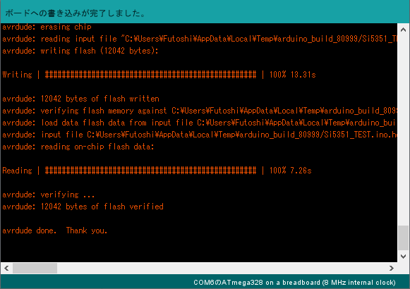 ATMEGA328P内部クロック設定時の書き込み 投稿日: 2019年11月16日2020年6月28日 投稿者: jg7sfrコメントする 内部クロック8MHzの設定で通常の書き込みをするとエラーが発生。 avrdude: stk500_getsync() attempt 1 of 10: not in sync: resp=0x1c このようなメッセージ そこで以下のメニューで書き込みを行うと 書き込みを完了することが出来る。