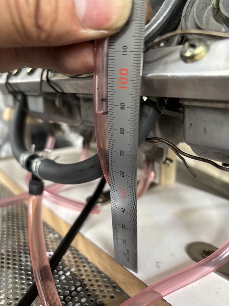 治具ができたことで、液面の測定が格段にしやすくなりました。とはいっても、キャブレターにガソリンを通して、液面を測りメモを取って、ばらす。フロートの金具を調整し、組んでいきます。繰り返すこと6~7回くらいだった気がします。