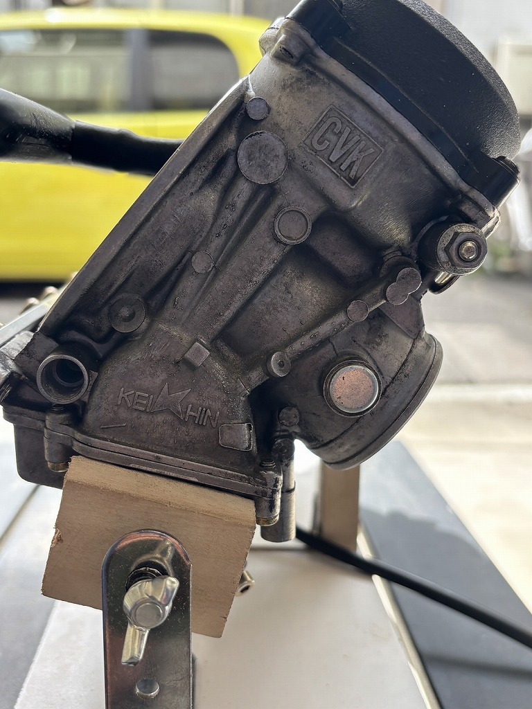 気を取り直しで作業を進めます。午前中はキャブレターを外しつつ、治具を作りつつ。先週苦労した教訓として、アクセルワイヤーをハンドル側で外し、キャブレター側のワイヤーも外しました。いとも簡単に。想像していた治具から徐々に外れていき、現場であれこれと考えた結果がこの通り。