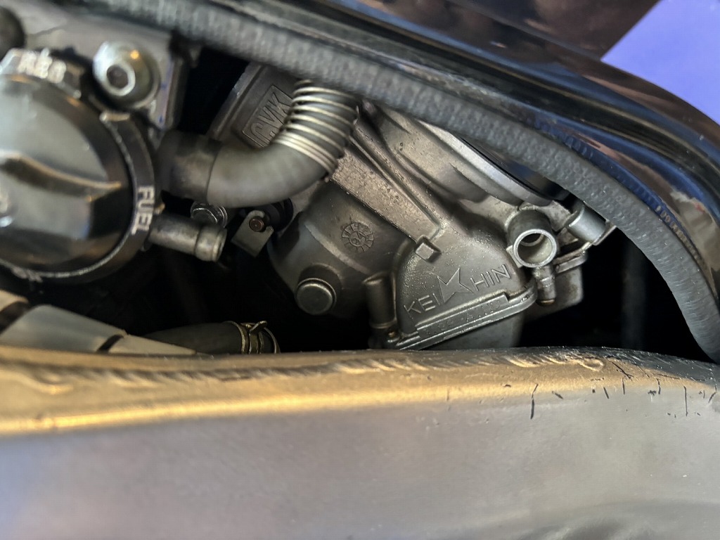 ということで、作業開始。先ずは燃料タンクを外していきます。燃料ホースを外そうと思って側面をみると・・・ホースが繋がっていません。まさか先週のエンジンダウンの原因はガス欠だったとは・・・。まいりました。液面を合わせたけどな。と。