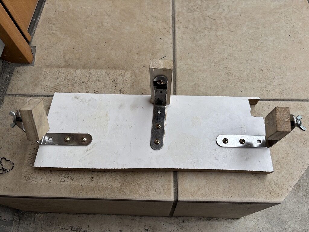これがキャブレターの治具。中央はバタフライの左右調整ねじ部を支える。左右はフロートチャンバーの側面を支える。