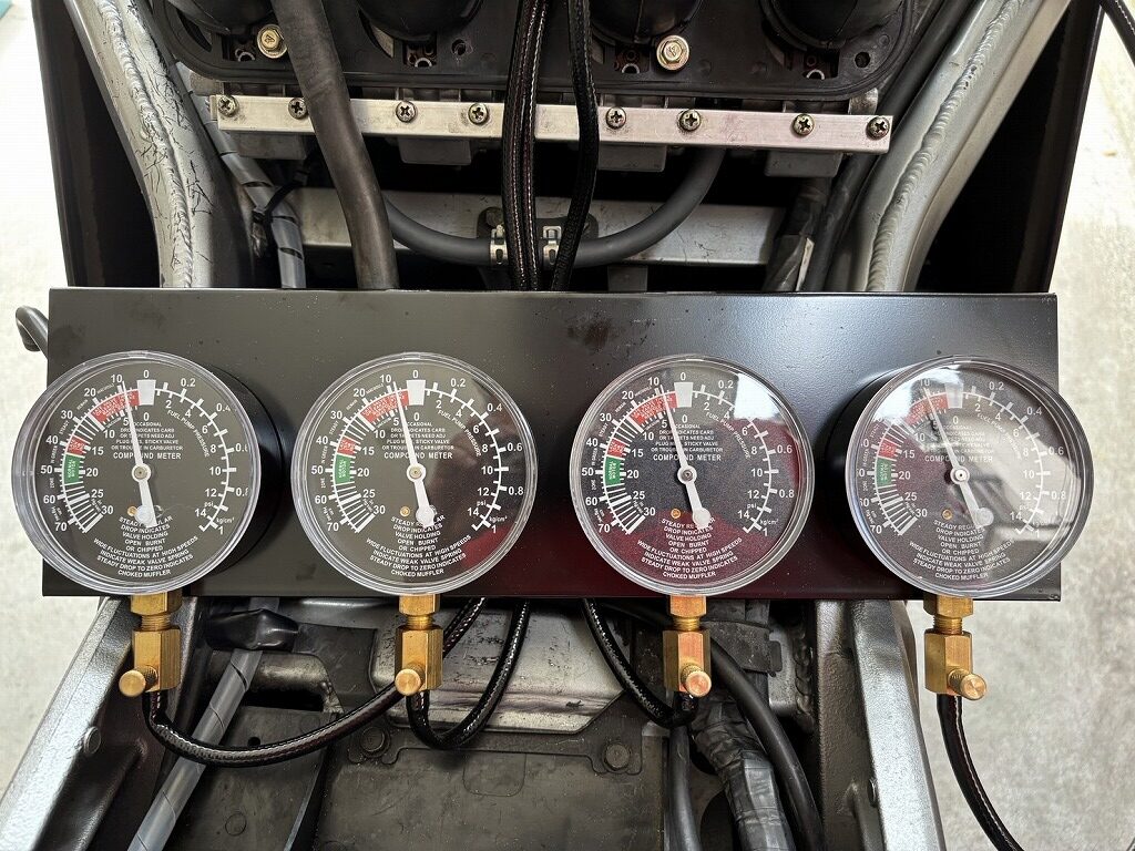 少しの間エンジンが掛からなかったものの、無事始動。フロートチャンバーにガソリンがいきわたってないのでしょうかね?長時間、エンジンを掛けっぱなしでも近所迷惑なので、軽く温まったところで、同調を確認。サービスマニュアル通りのパイロットスクリューの開度。あとはキャブレターはバタフライを目視で調整してあります。バタフライがどの位置にあるべきなのかがわからず。4つ全ての見た目のバタフライバルブを揃えていますが、わずかな違いがあるのでしょう。負圧計に表れているようです。