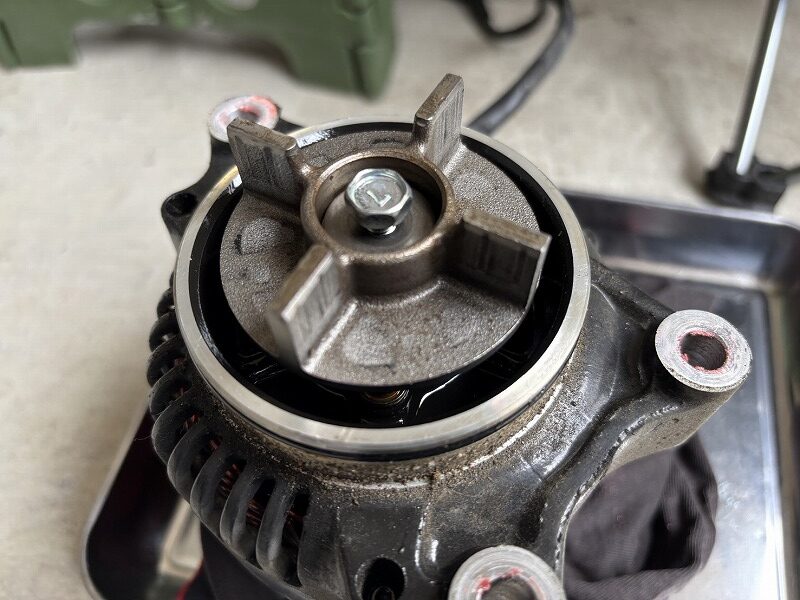 諸先輩方のブログでよく取り上げられる項目です。カタカタと音が鳴っていました。恐らくこのカップリングが軸芯のボルトが緩んだことで、ずれ動く音なのでしょう。パーツクリーナーで脱脂をしねじロックをこのボルトにも塗布し締めました。オルタネータの固定ボルト3本にもねじロックが塗布されていますが、そこじゃなくてこの軸芯のボルトの緩み対策のほうが大事なんじゃない?とカワサキに言いたい。Oリングを用意していなかったので、掃除をしてラバーグリスを塗って組付け。Oリングや内部のベアリングを交換したほうがよさそう。オイルシールも必要そうですし。細かい部分を維持していかないと、どこかで痛い目にあいそうですね。