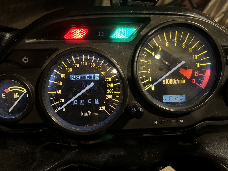 ライトは、ロービームでそれほど明るくなかった。ハイビームは試してないです。田舎の道は暗いので不安ですね。メーターパネルは画像の通り。