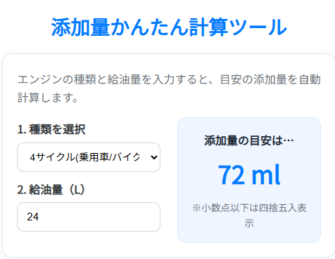 因みにエーゼットのサイトには添加量かんたん計算ツールというのがあって、燃料タンクの量を入力すれば添加量を計算してくれます。