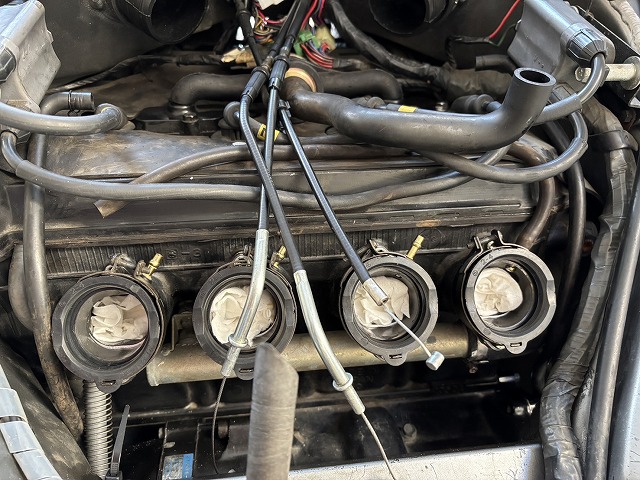 結局はバッテリーがダメなのでしょう。エンジンのかかりが良くないなとは思っていましたが。いい経験ができました。セルは回ってもポンプは回らないという症状。こういうことをしていたので、混合気が薄い?とおもって90度戻して2回転戻しとなったわけです。あとは午前中にキャブを組んだ時点で、今までインシュレータに確りはまっていなかった可能性があるようなので、今回は確実に入れました。キャブを。午前中にバタフライの再調整もしました。