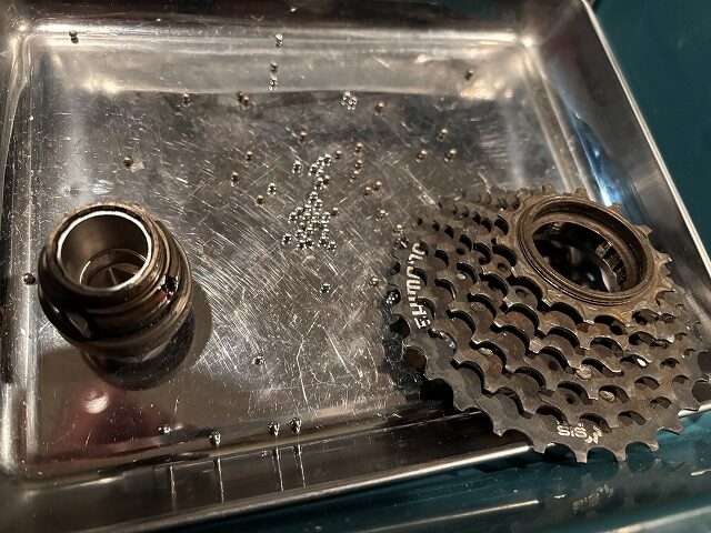 帰宅後確認すると、確かにリアスプロケットのラチェットが重くて回りにくい。ペダルの逆回転でチェーンが外れる。なぜ重いのか心当たり無し。結局ばらすことにする。自転車は普段使わないサイズの工具が必要だし扱いにくい。ラチェット部の蓋を回す工具が無く仕方なくPBのピン抜きを使うも折損。マジか。貫通ドライバを使用しやっと回る。そもそも逆ねじだったみたい。分解すると、グリスが固まり粘性が高まって動きが重い。それだけ。パーツクリーナーで古いグリスを取り除き、普通のリチウムグリスを付けて組む。グリスが無いと、球が固定できないので。組んだ後、当然のように回りは悪いので、隙間からパーツクリーナーを吹き付ける。軽くなったところで、シリコングリースを吹く。軽すぎるか。通常はどんなグリースをいれるものだろう。動画を調べてグリースを確認すると、純正との事。種類までの情報が無かった。残念な動画。