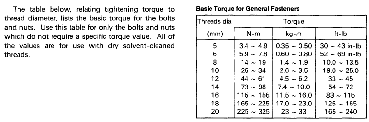 サービスマニュアルで指定のないボルトやナットの締め付けトルク(サービスマニュアルより抜粋)