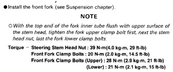 インナーチューブの上端がステムヘッドと面一(ツライチ、平らに)し、上のクランプボルトを最初に締め、次にステムナット、最後にしたのクランプボルトを締める。